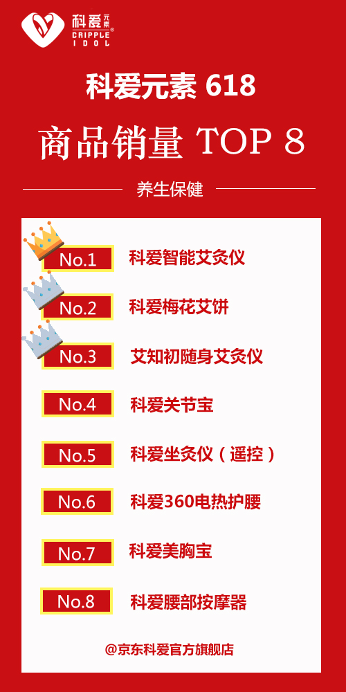 在科愛元素公布的這份“618京東店鋪銷量Top8”榜單中,涵蓋了智能艾灸儀器、遠紅外按摩系列和傳統艾灸耗材等多個系列產品。
